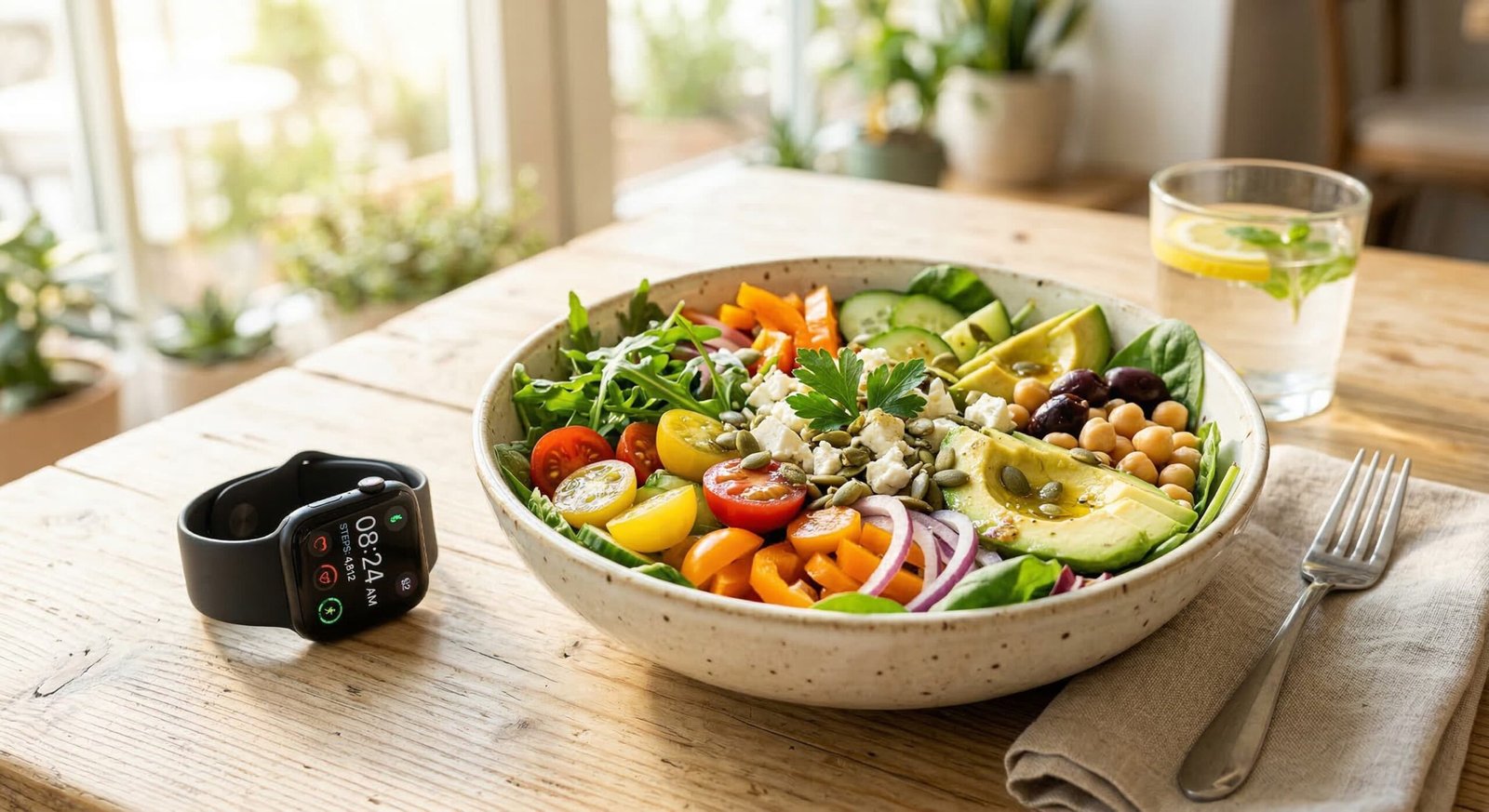الخيار الأول: بيضتان مسلوقتان + نصف رغيف خبز أسمر (أو خبز شعير) + طبق سلطة خضراء (خيار، طماطم، خس).
